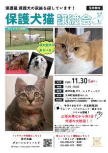 11月30日は譲渡会です。ドッグランは利用料500円(新規会員登録は必要ですが登録料無料)です。詳しくはお電話でお問い合わせください。
